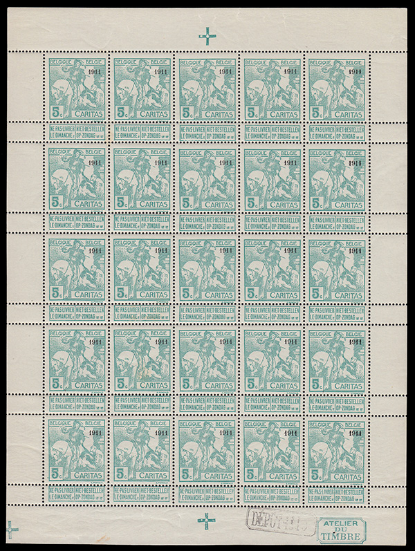 1 lots, 1 pages : page 1 / 1 Lot N° 37N° F96**. 'Caritas' 5 centimes vert-bleu surchargés 1911 en feuillet entier** de 25 exemplaires**. Type Montald. Pleine gomme originale et sans trace de charnière ni sur les timbres ni sur les bords du feuillet. Trois croix de repères, inscriptions marginales 'ATELIER DU TIMBRE' et 'DÉPÔT-1910'. Fraîcheur postale. T.B. Ce lot sera adjugé le 14 décembre 2025 à 18 h 36' 00'' soit dans Votre numéro d'acheteur : n°